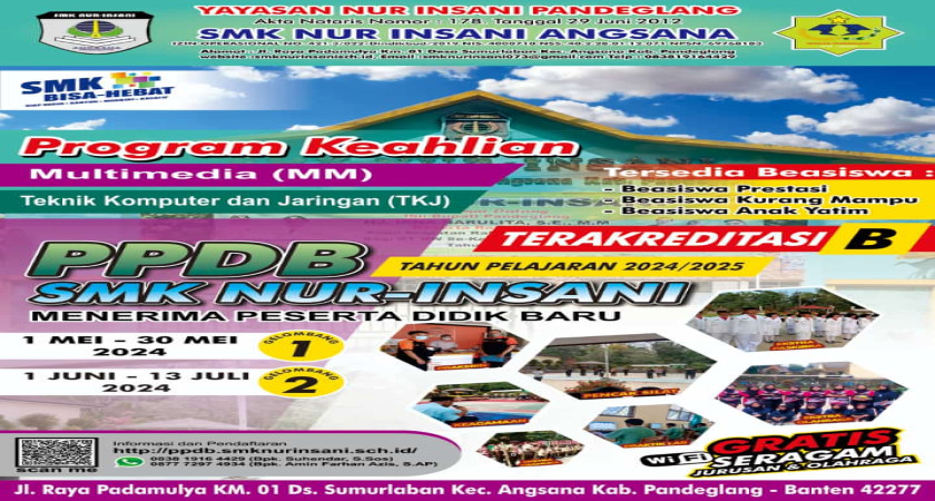 SMK Nur Insani Angsana, salah satu SMK unggulan di Kabupaten Pandeglang, membuka Penerimaan Peserta Didik Baru (PPDB) tahun ajaran 2025/2026. Jurusan Unggulan: Teknik Komputer dan J